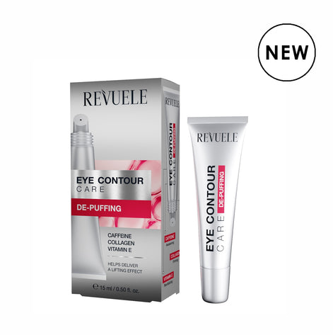 REVUELE EYE CONTOUR CARE DE-PUFFING. The ultimate solution for tired, puffy eyes that will rejuvenate, and refresh the eye contour area. The powerful formula with Caffeine reduces the appearance of puffiness and eye bags, while Collagen works to replenish the skin’s moisture barrier, leaving skin hydrated and supple. Enriched also with Vitamin E to revitalize and nourish the delicate skin around the eyes, restoring a youthful look.
