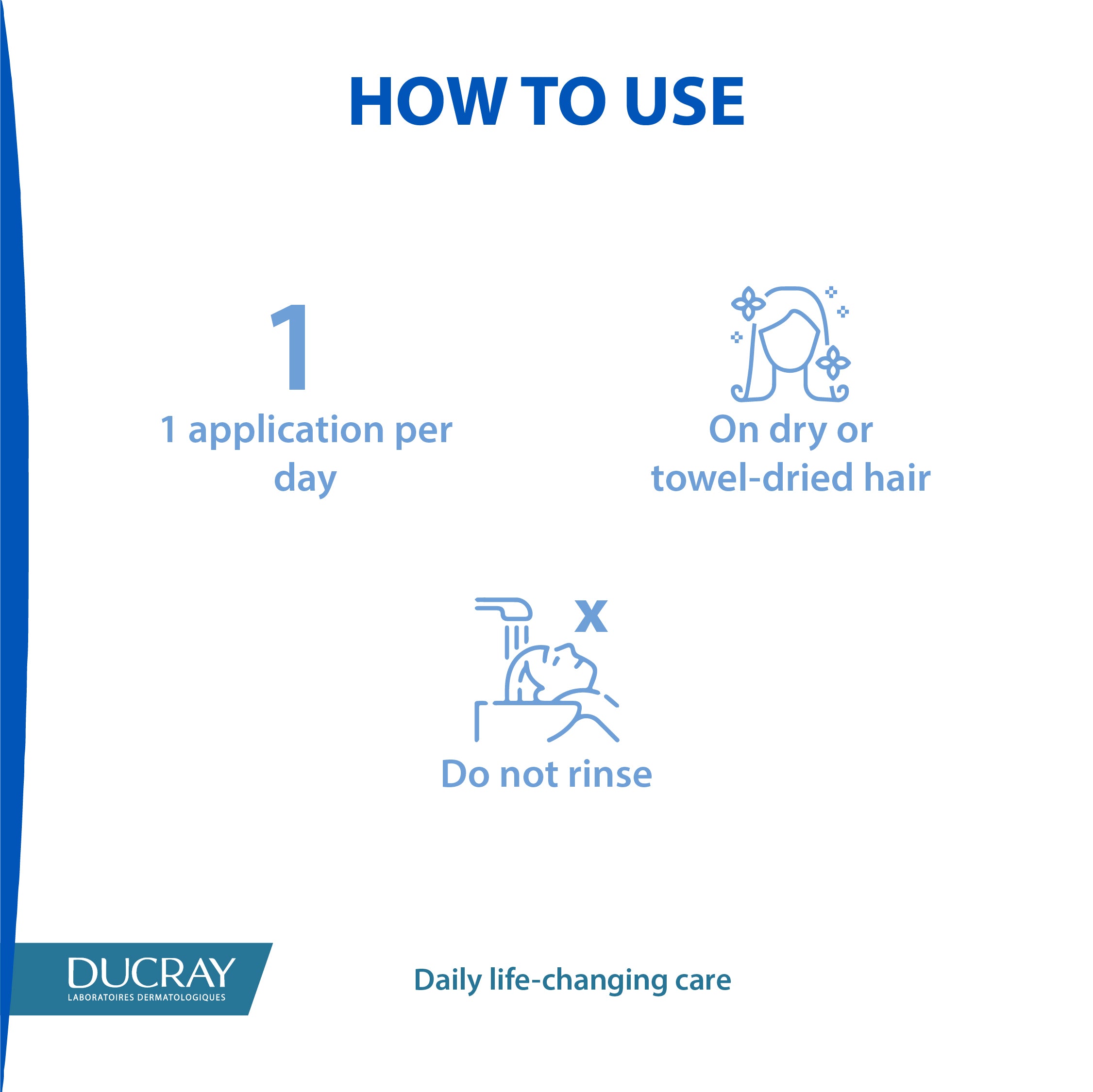 Apply daily to a dry or damp scalp. Massage gently. No-rinse . Avoid contact with the eyes. Starting 18 years old.