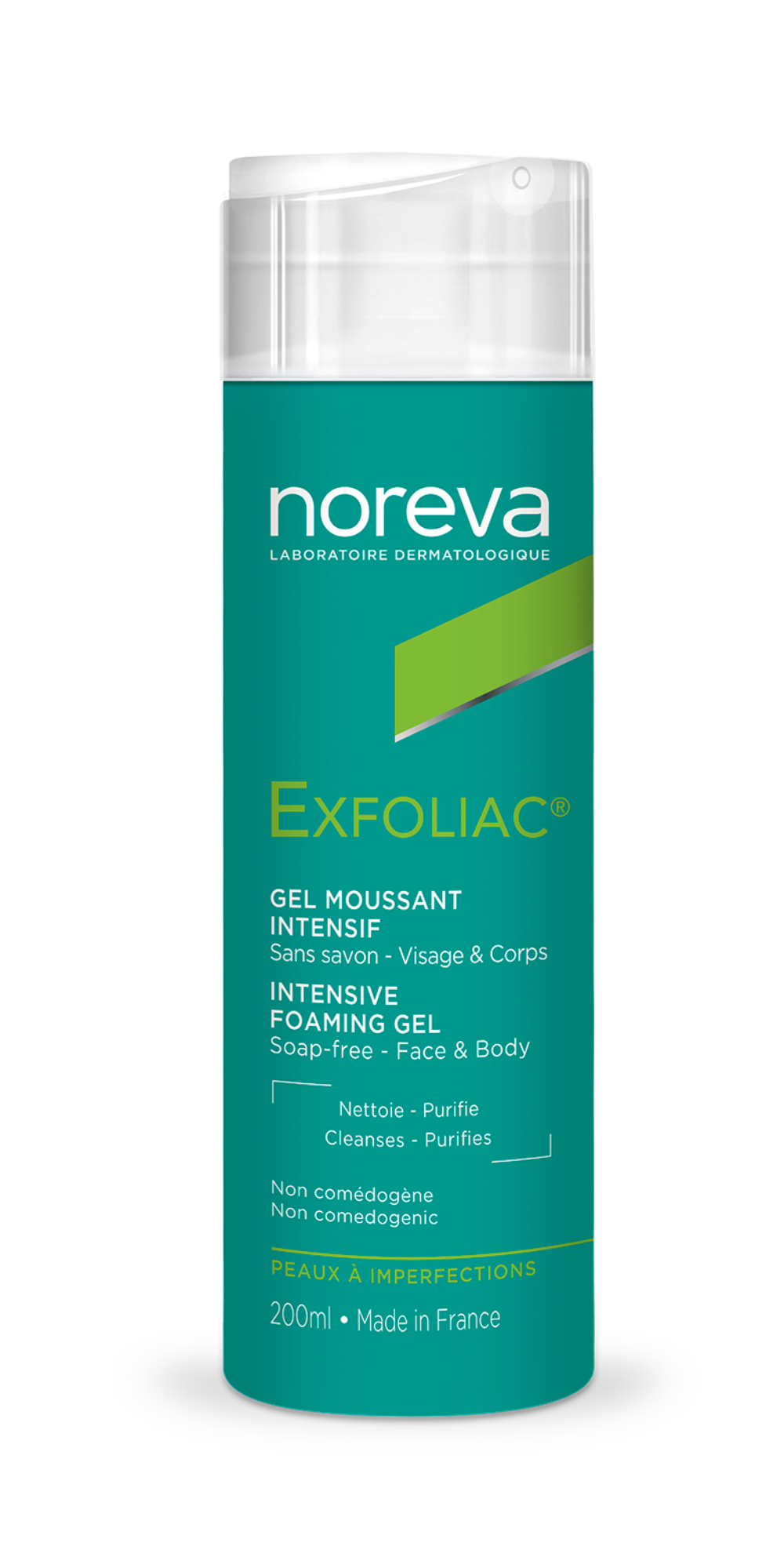 Thanks to its exfoliating properties, our Exfoliac® Intensive Foaming Gel formula is the ally for skin with more severe imperfections. Specially designed to cleanse young skin with imperfections, Exfoliac® Intensive Foaming Gel promotes the elimination of impurities, regulates sebum secretion while respecting skin pH. It reduces bacterial proliferation and maintains long-lasting cleansing of the epidermis. The skin rediscovers a clearer appearance, the pores are tightened and the complexion is radiant., inner arms and thighs).Its fluid, light texture soaks in quickly and leaves the skin firm, soft and smooth, giving it a satiny and more radiant appearance.