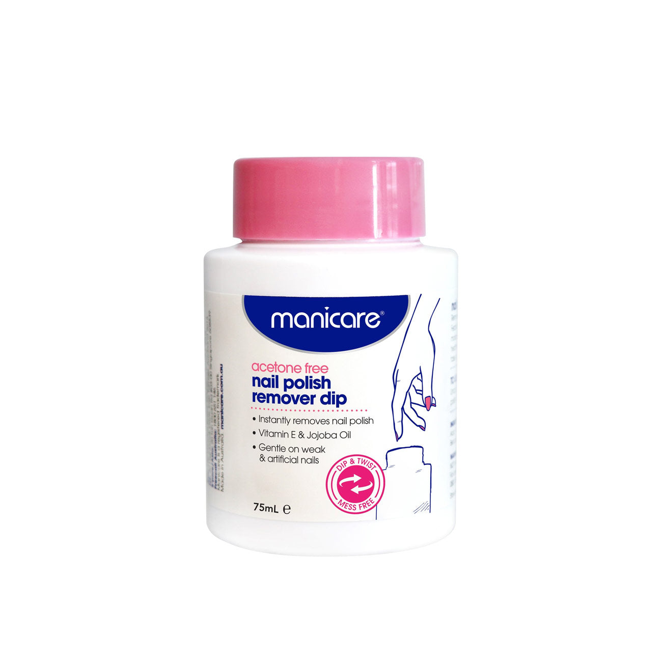 Gentle on weak & artificial nails.Manicare Acetone Free Nail Polish Remover Dip instantly removes nail polish with ease. , Remove all traces of nail polish instantly in one dip and twist. Featuring an acetone free pre-soaked sponge enriched with moisturising Vitamin E and Jojoba Oil to condition and promote healthy nails and cuticles. Perfect for quick fixes and gentle on weak and artificial nails.