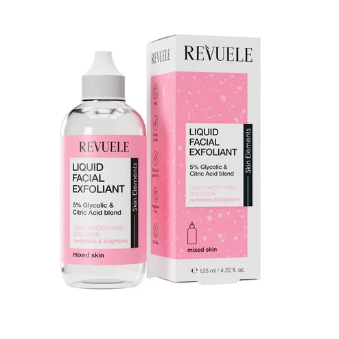 REVUELE LIQUID FACIAL EXFOLIANT 5% GLYCOLIC + CITRIC ACID BLEND is an ultra-gentle daily smoothing solution composed by a mix of delicate peeling acids.