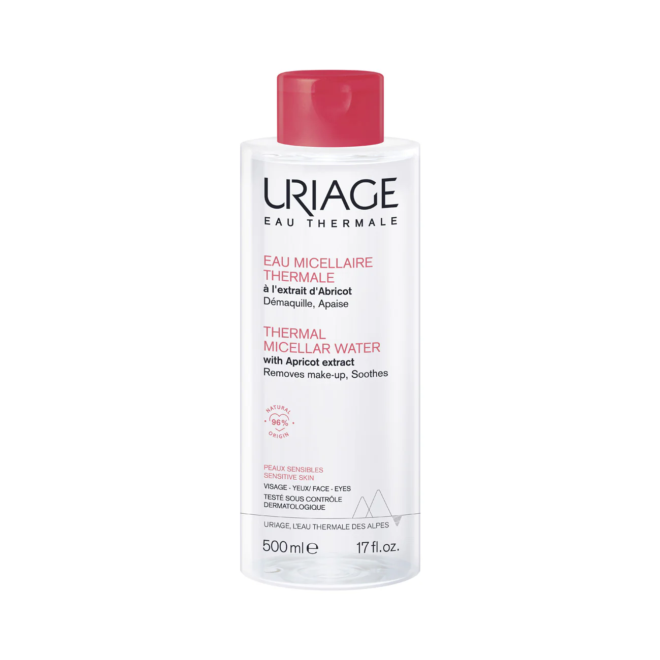 Soak a cotton pad with Thermal Micellar Water and gently wipe over the face, eyes and neck to cleanse in a single step, without rinsing. Complete the eye make-up removal with the Waterproof Eye Make-up Remover. Spray Uriage Thermal Water all over the face and let it penetrate. Do not dry. Finish by applying your daily care product.